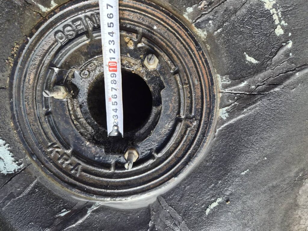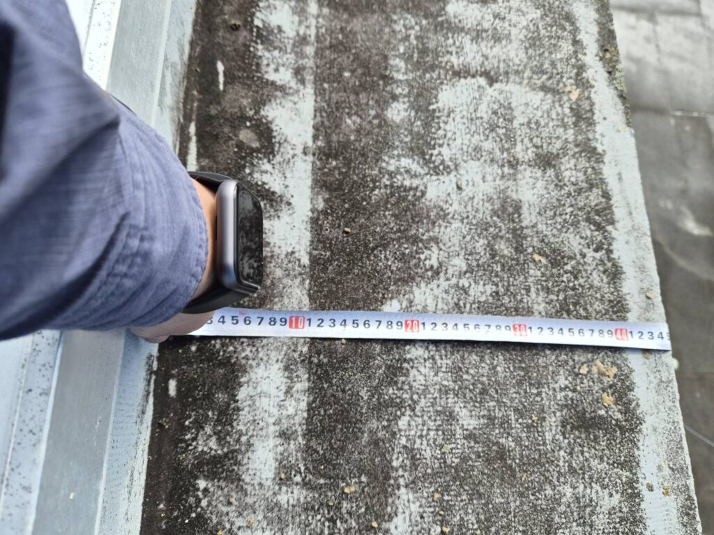 この現場は、遠方ということもあり、数量表や現場の写真などを参考に見積の作成・提出を行いました。そして、受注決定の連絡をいただいた時点で現地調査を行いました。現地調査では、施工範囲の屋上の様子の写真撮影、改修で交換するドレンのサイズ測定、荷揚げのときに入場するクレーンの停車位置を確定させるための道幅の測定などを行うとともに、管理人様から作業員の駐車場の位置や工事期間中にお借りできる水道・トイレの場所などを教えていただきました。