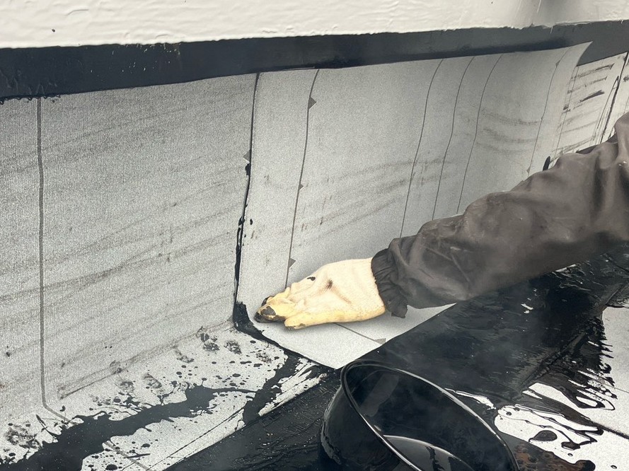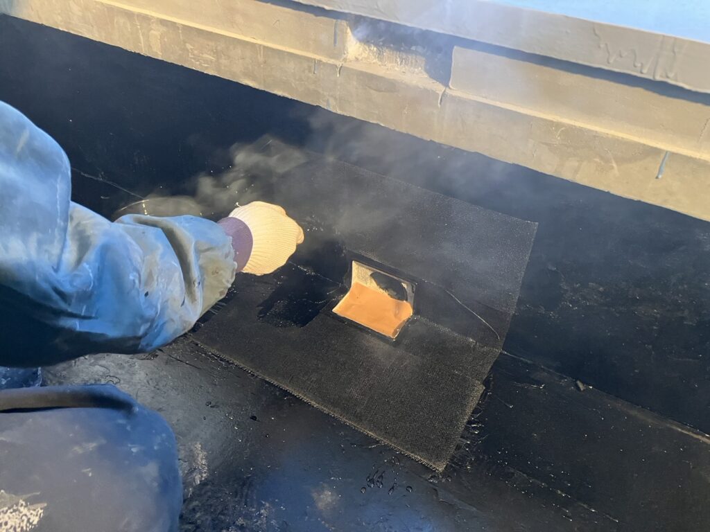 紹介する施工は、加熱型改質アスファルト塗膜防水工法のアスリード工法(日本アスファルト防水工業協同組合)の高耐久仕様であります。こちらの仕様は、想定耐用年数が55年になっています。半世紀以上先まで建物を守ると考えれば、当然のことながら大きな責任を背負い施工を行う必要があります。漏水の要因になりやすい箇所は、特に注意を払いながら施工を進めます。ドレン廻り等は1枚多くルーフィングを貼る増張り施工をします。
