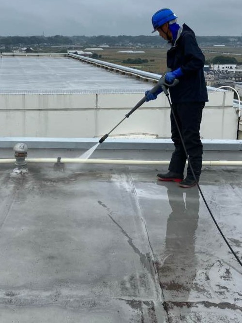 改修工事の場合、防水工事の施工に入る前に高圧洗浄機を使って水洗い清掃を行います。